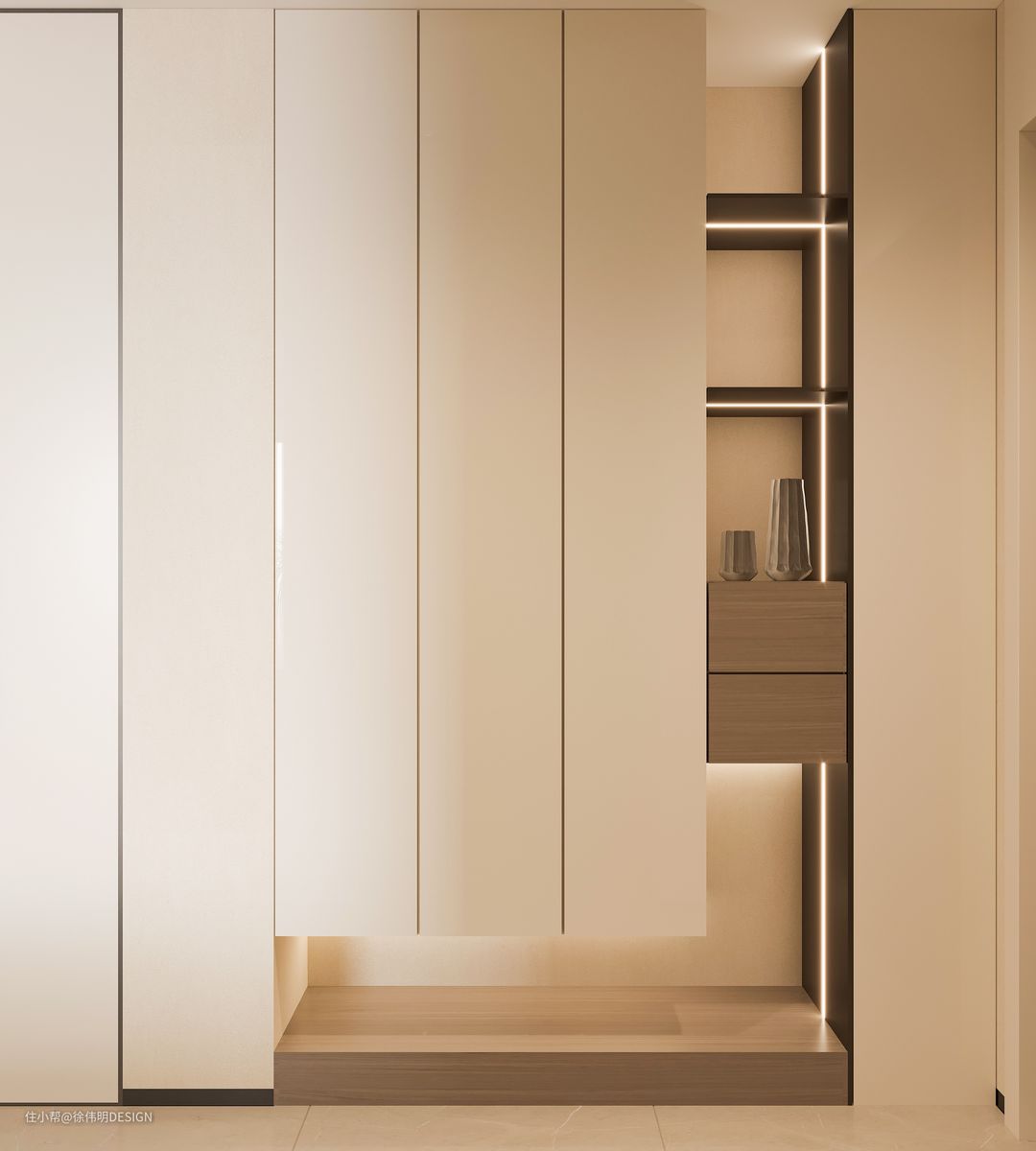 柜体边缘和底部采用错落隔断造型,辅以灯带点睛,缓和了大型柜体突兀感的同时又可以收纳鞋子和一些家居小物件,让人一进门就感觉到舒适又放松。