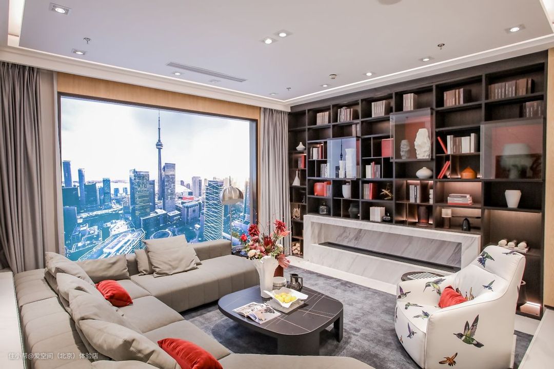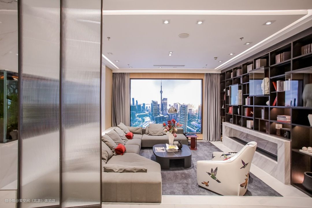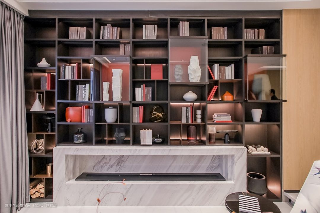置物架采用法尼尼品牌定制,客厅不放电视,巧用墙面开辟展示区,置物架将墙面空间充分利用起来,嵌入灯带,提升氛围感,用于展示陈列主人心爱的收藏品等物品。
