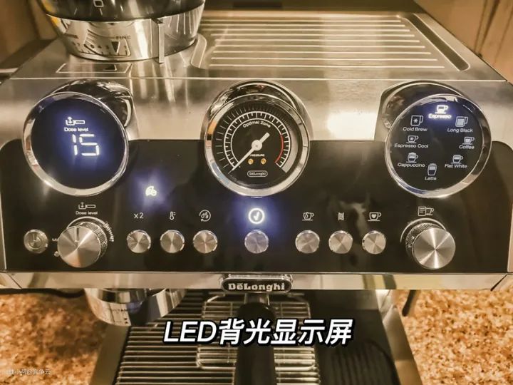 但对于拥有德龙银骑士EC9865半自动咖啡机的咖啡新手来说,要想拿捏好尺度、稳定的萃取出理想的咖啡就变得很容易了。原因就在于它配备的三块LED背光显示屏: