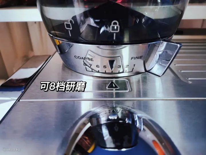 德龙银骑士EC9865自带8个研磨档位,1-8档依次由细到粗,大家可根据所用的咖啡豆的烘焙程度和个