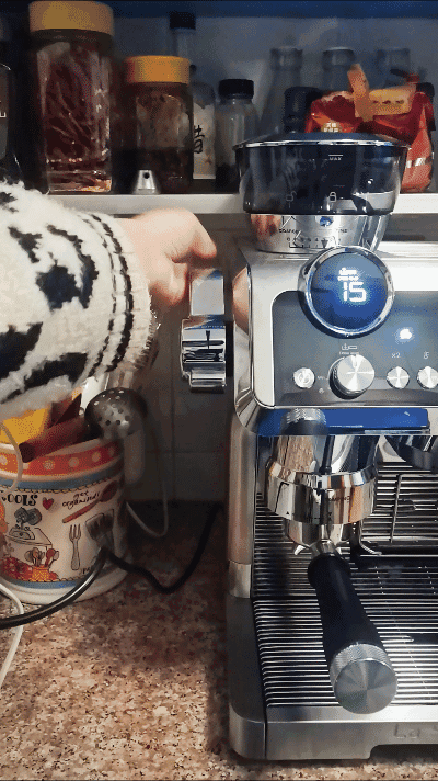 最左侧的显示屏可精准控制咖啡粉量、萃取温度和萃取进程。除了研磨度和粉量可以自行调节外,还一共有5档萃取温度可选,大家可根据咖啡豆的烘焙程度来自由选择适合的咖啡粉量及萃取的温度.