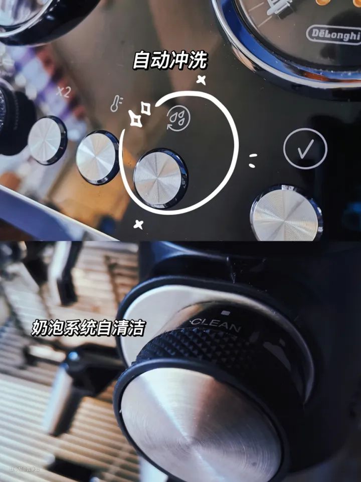 但德龙银骑士EC9865半自动咖啡机的内部管道可以自清洁,有自动除垢程序,奶缸都可以自动清洁、除去管道内的奶泡残留。按下冲洗键,还能有针对性的冲洗咖啡机萃取口。