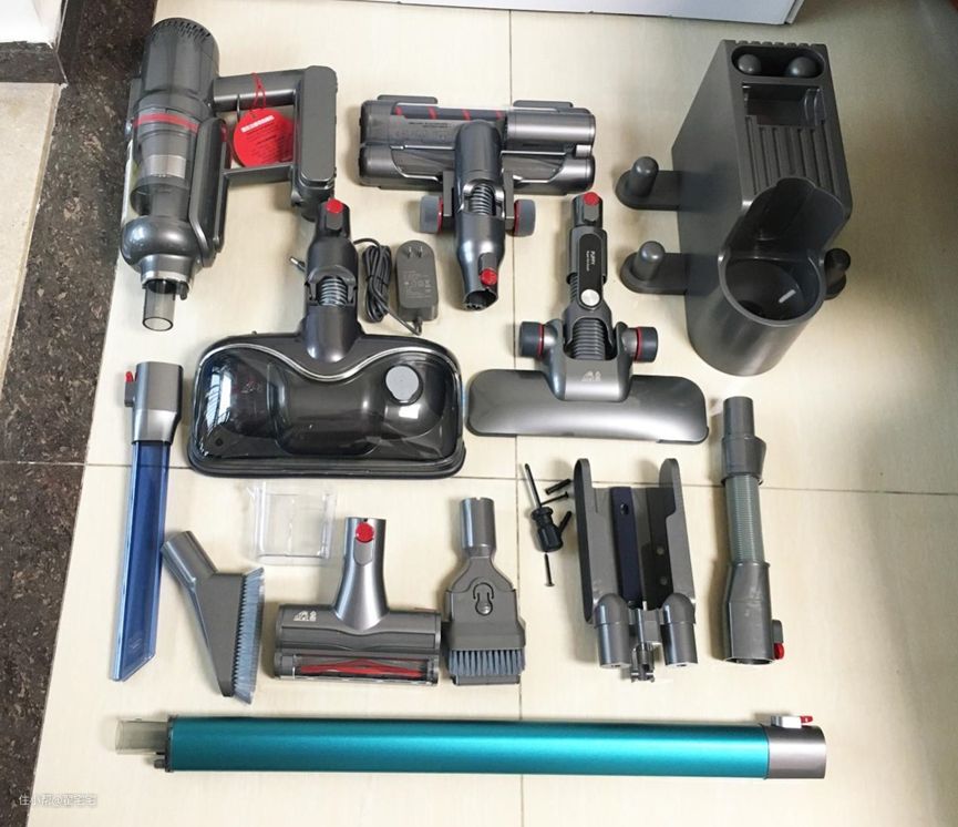 依次为:旋转擦地刷、双滚电动地刷、超薄地刷(全新刷头)、电动除螨刷、软羽刷、二合一宽嘴刷、照明长扁吸、伸缩软管(配件)
