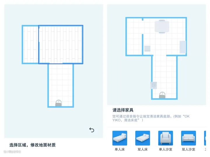 通过3D建图摆放好家具所在的位置,可以让科沃斯T10 OMNI的语音助手功能更实用,只需要喊出清洁的具体位置,比如“OK YIKO,清洁床底”它就会颠儿颠儿的去给你扫床底啦~非常实用而且有趣!