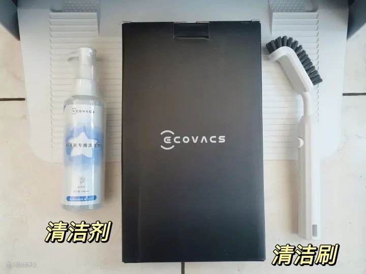 两个水箱中间夹着的盒子里,放置的是科沃斯机器人的专用清洁液和基站清洁刷。