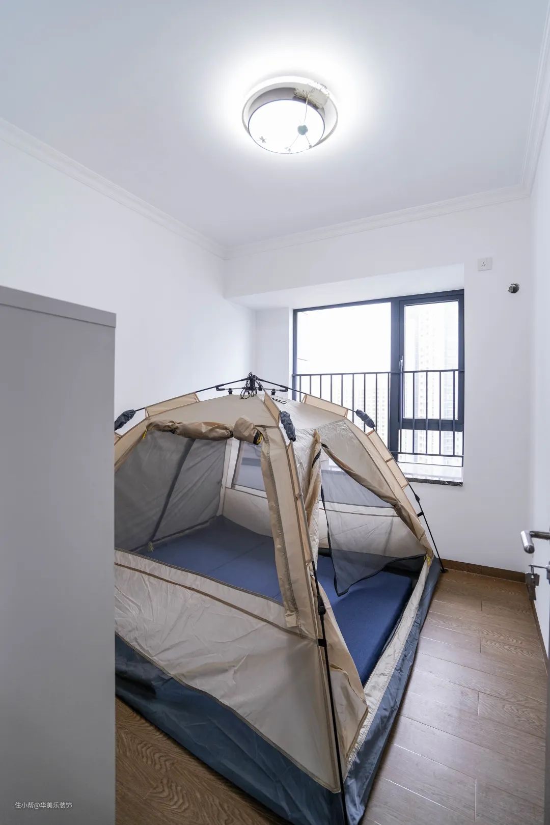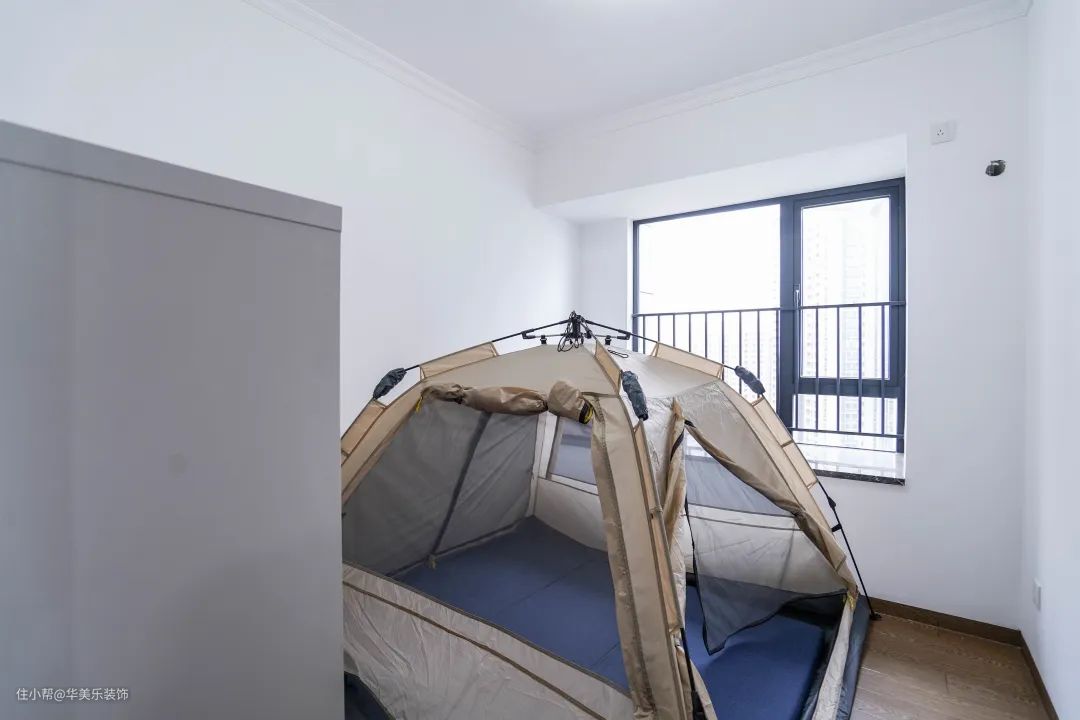 客卧现在闲置着,没有家具和床垫,业主两人平时喜欢露营,所以放了一个帐篷,到时有二胎后,会布局为儿童房。