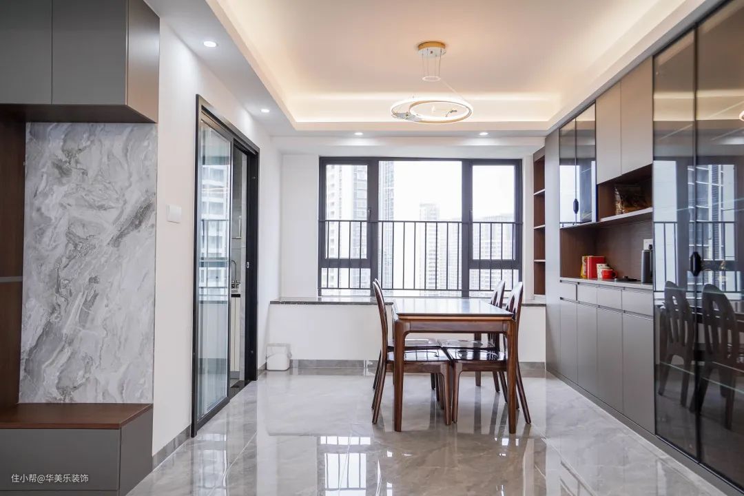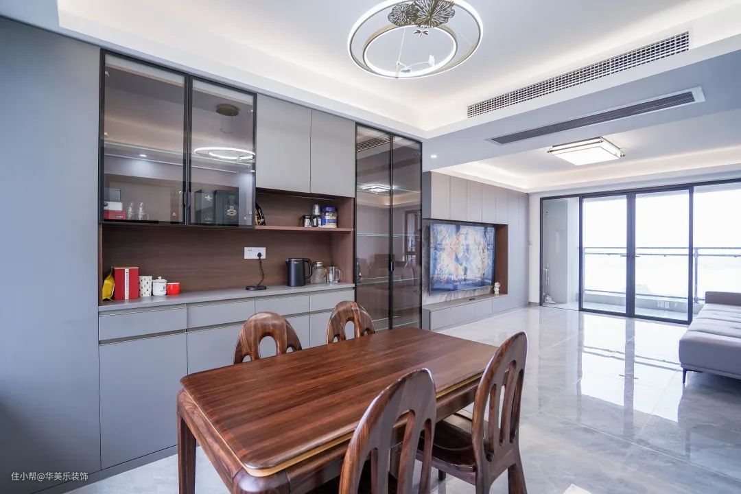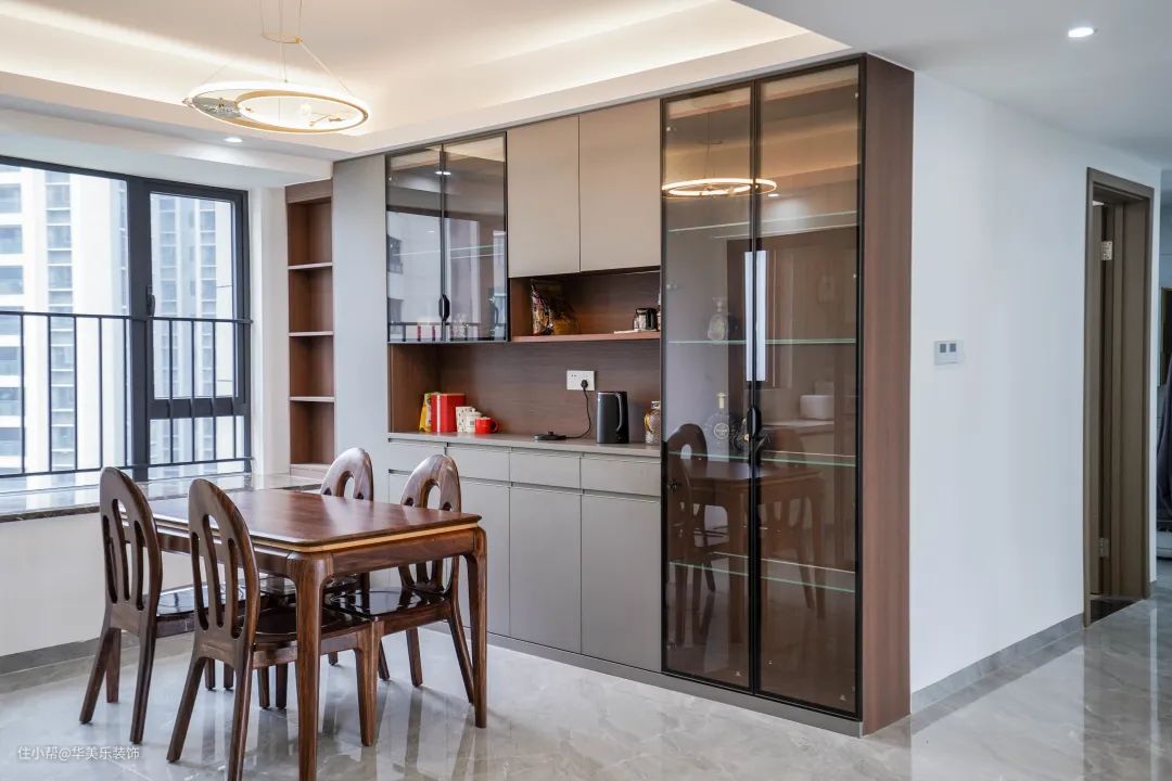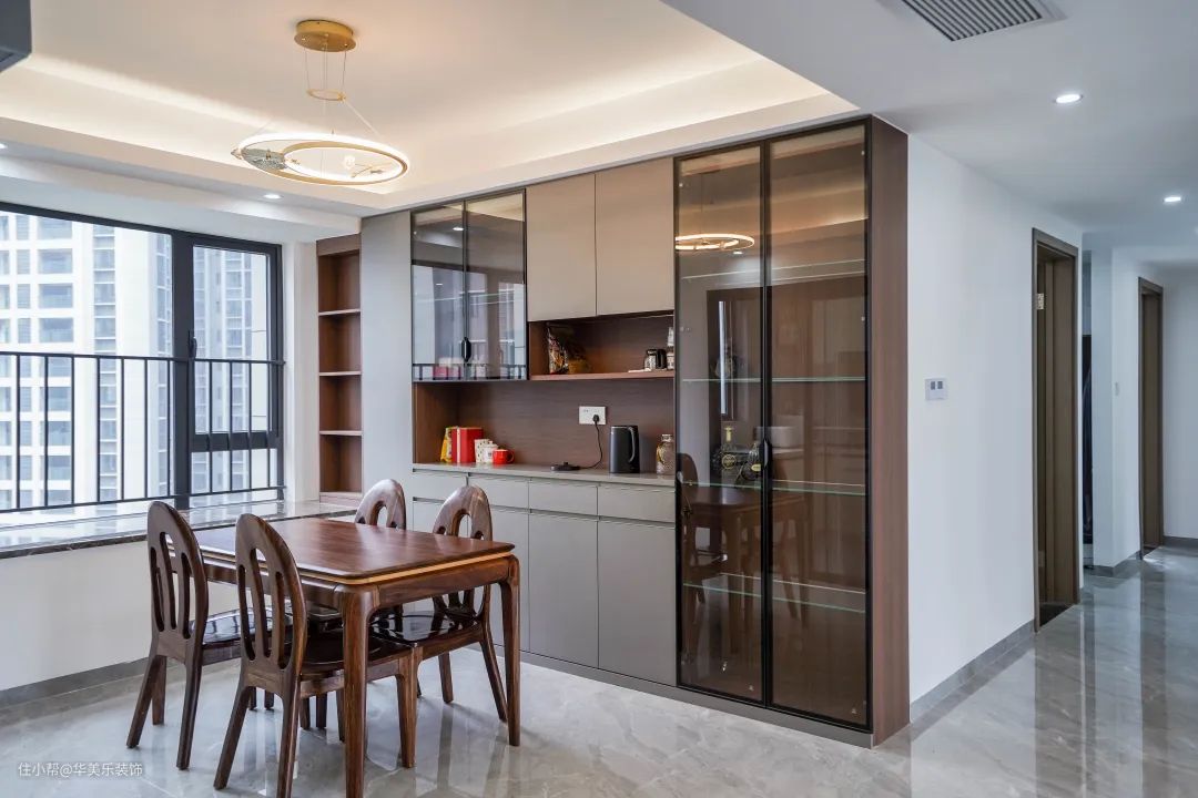 我们采用现代简约+中式实木餐桌,提升了整个空间的质感格调,还非常实用,让人有眼前一亮的感觉。