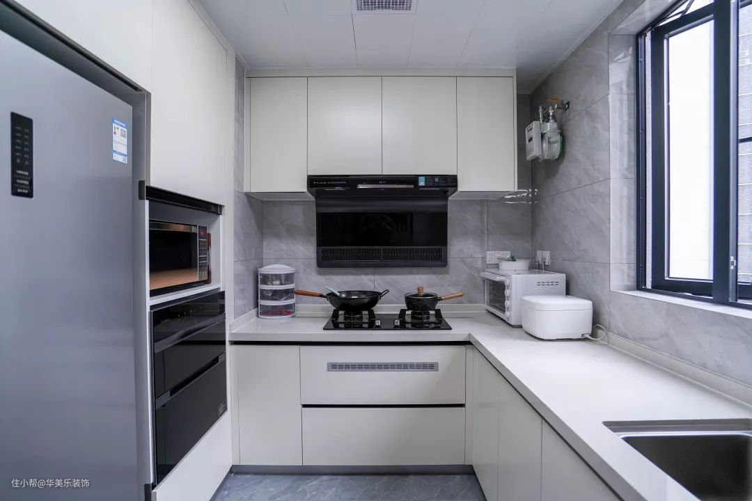 厨房是U型布局,白色橱柜,简约大方又百搭,自带轻盈感。如果大家不知道选什么颜色,可以试试这个颜色,一般都不会出错。