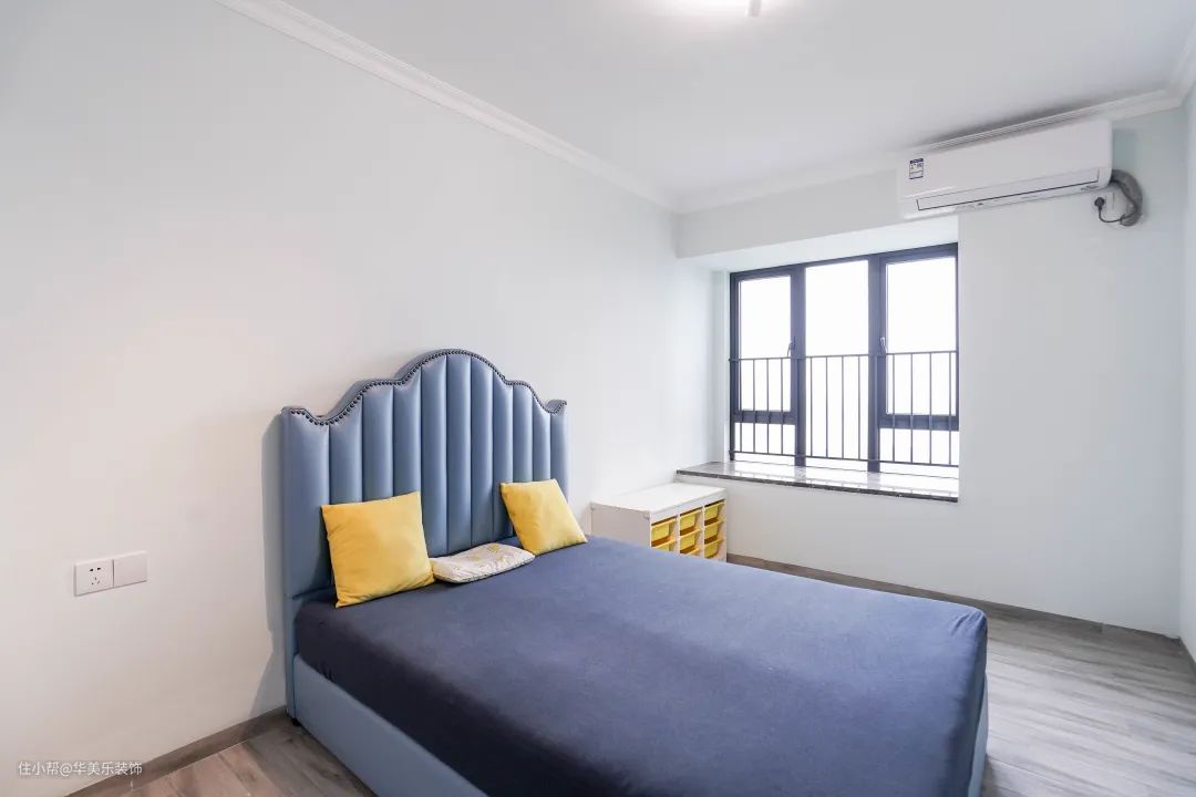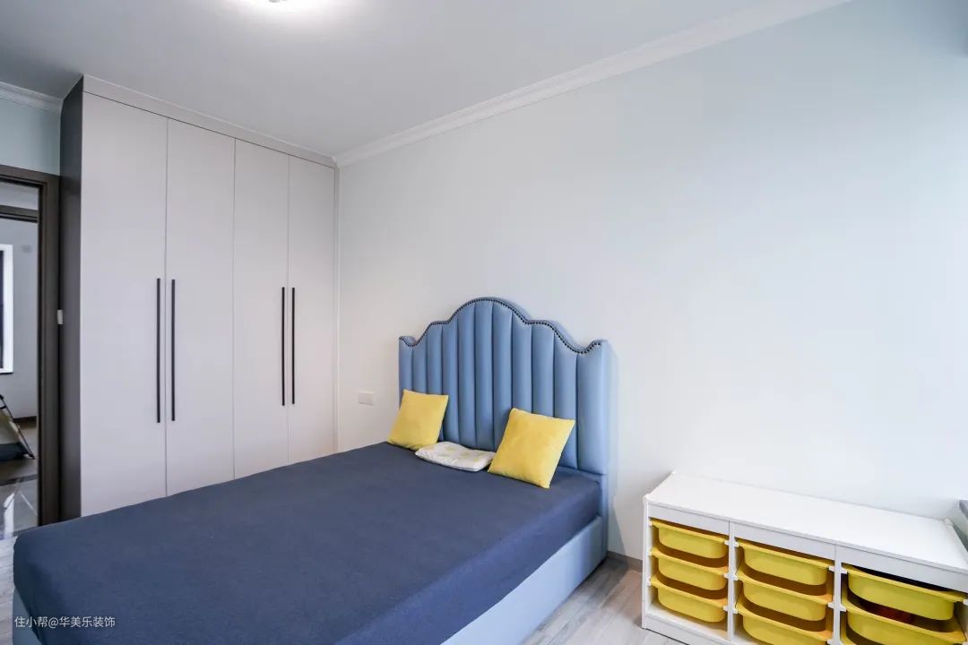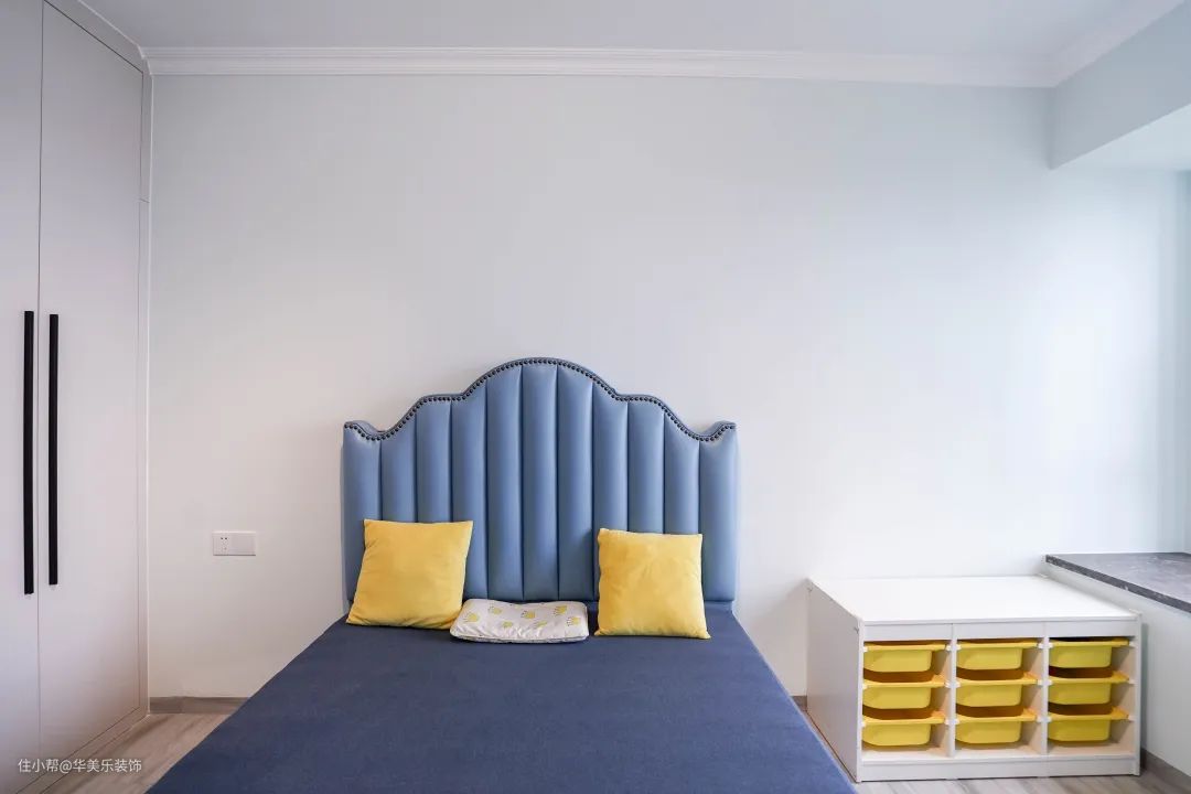 男孩房整体配色没有超过三种,明度也比较低,舒适又清爽。蓝色还有镇静安神的作用,非常适合用在卧室。