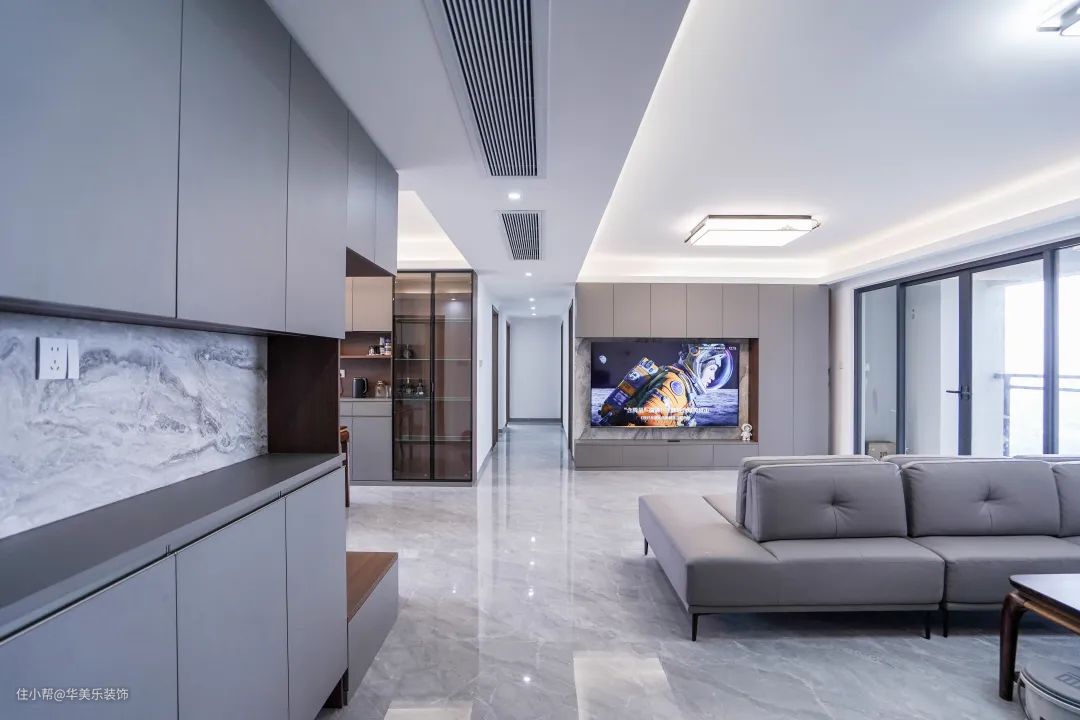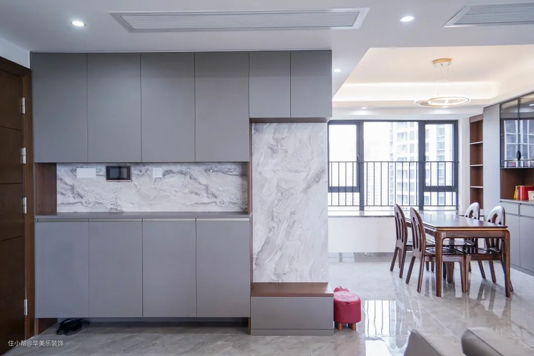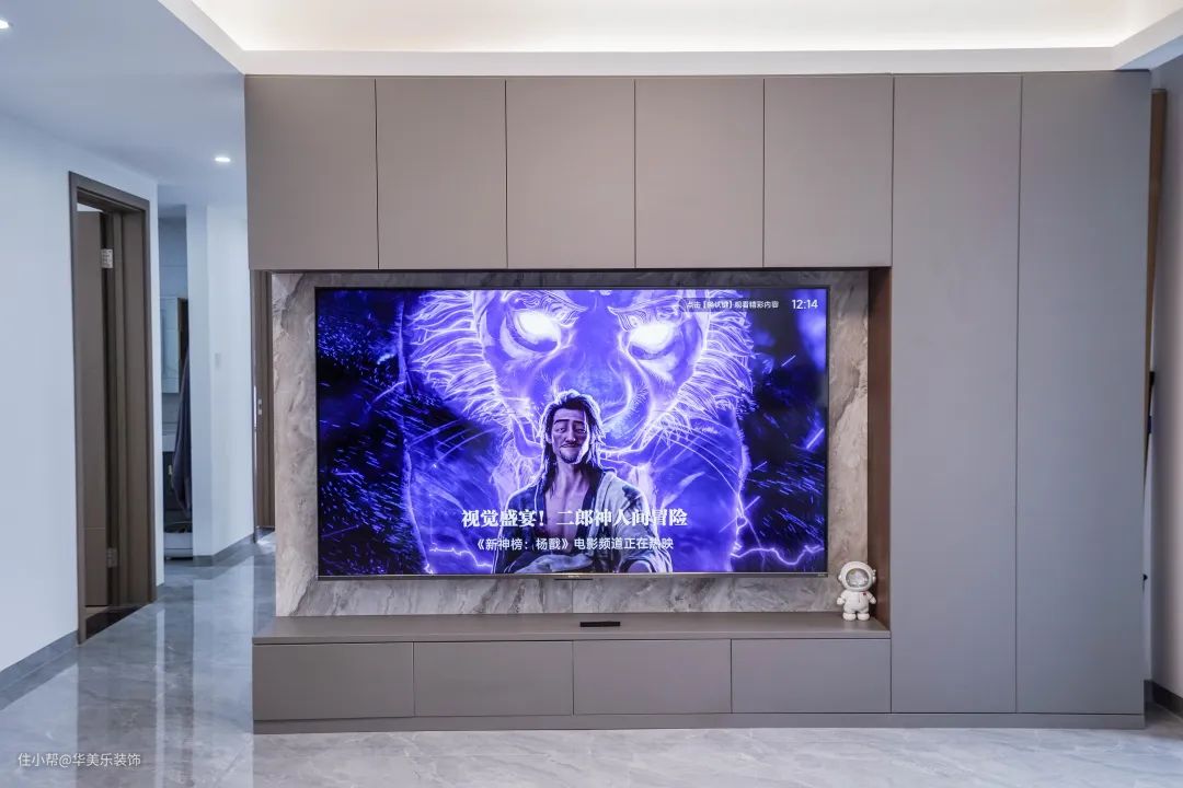 为了满足业主对于客厅收纳的需求,我们定做了电视收纳柜大理石背景墙,中间嵌入电视,非常有现代气息。一整个墙的收纳柜,功能性非常强,整洁大方又干净利落。