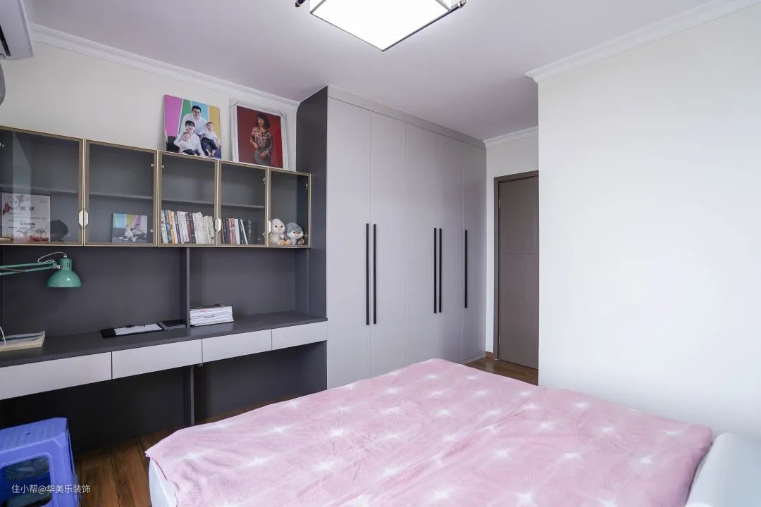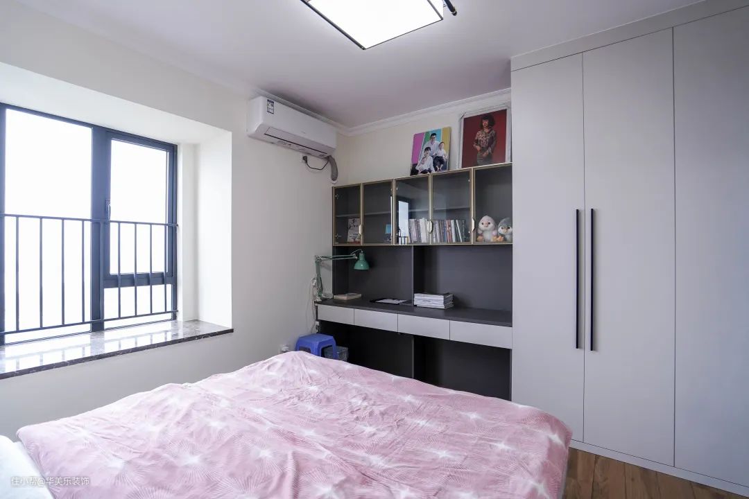主卧是休息区+卫生间的组合布局,保留了精装的卧室功能空间布局。床尾增加了一整面到顶的柜子,搭配梳妆台,很实用。