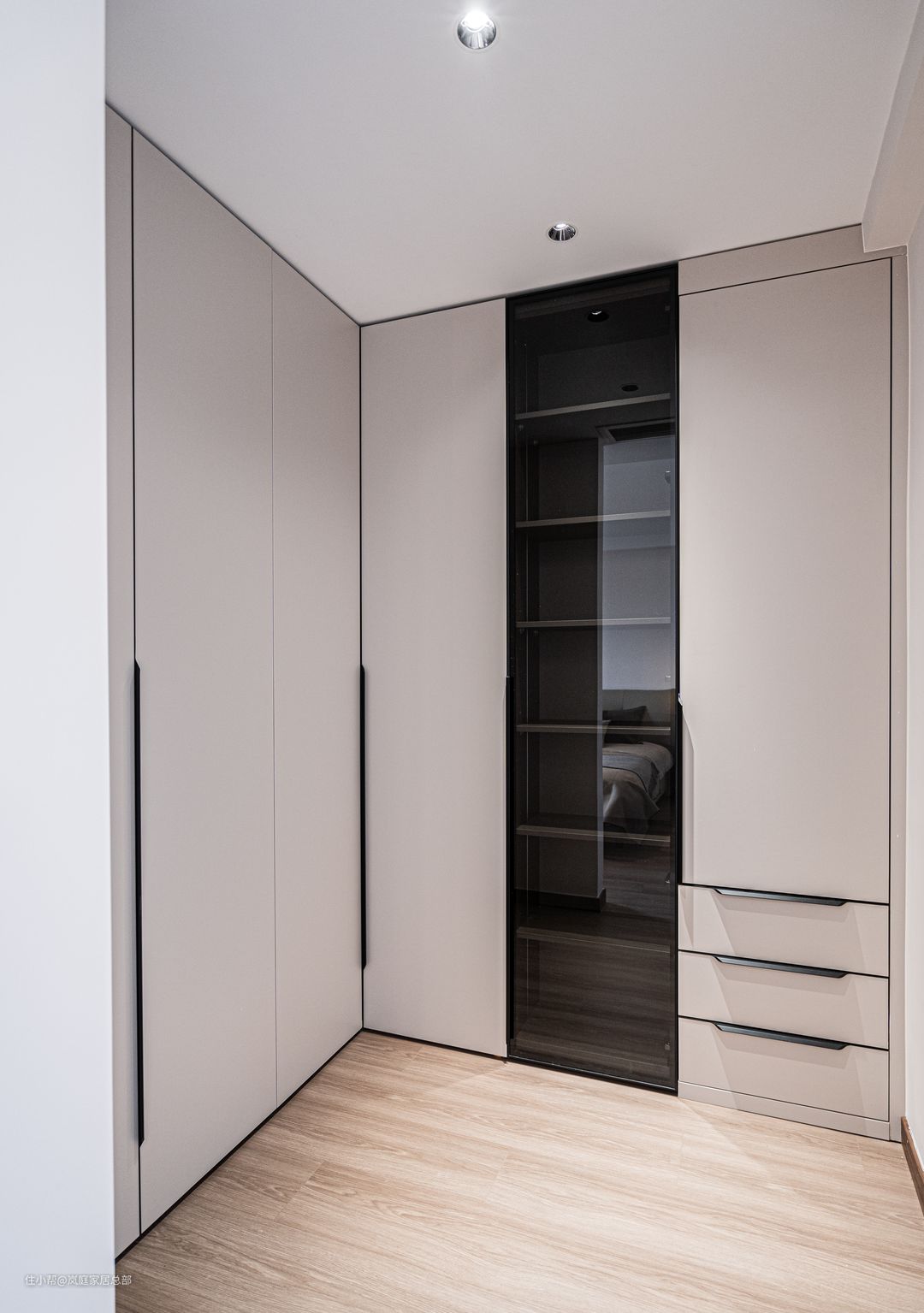 利用转角空间做L型衣帽间,充分利用边角空间,柜门选择卡其灰,侧装1m的黑色拉手,让柜门设计更高级大气。特意将中间做灰玻柜门,可以放置女主人的包包,做成一个展示区。衣帽间利用筒灯照明,简单大气的灯光设计不会破坏空间美感。