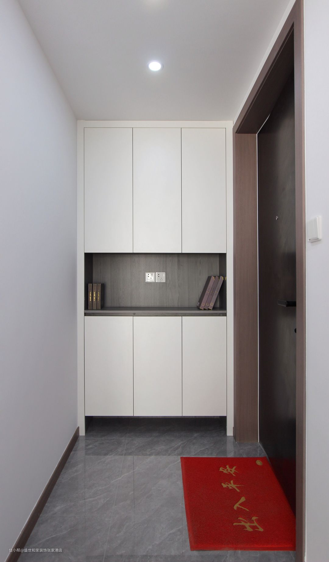入户的一侧打造嵌入式玄关柜,中间镂空区域方便随手放置包包和钥匙等物品,玄关柜底部的留空便于放置更换的鞋,方便实用。