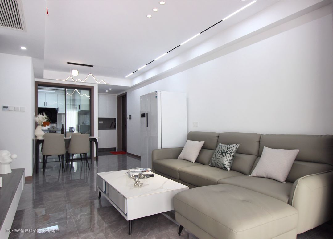 客厅以全白基调为主,采用简练的设计手法将空间感做到最大,吊顶使用了无主灯设计,顶面没有了大型灯具自然就不会有压抑感,用磁吸轨道灯和筒灯代替吊灯,使得空间更有纵深感。