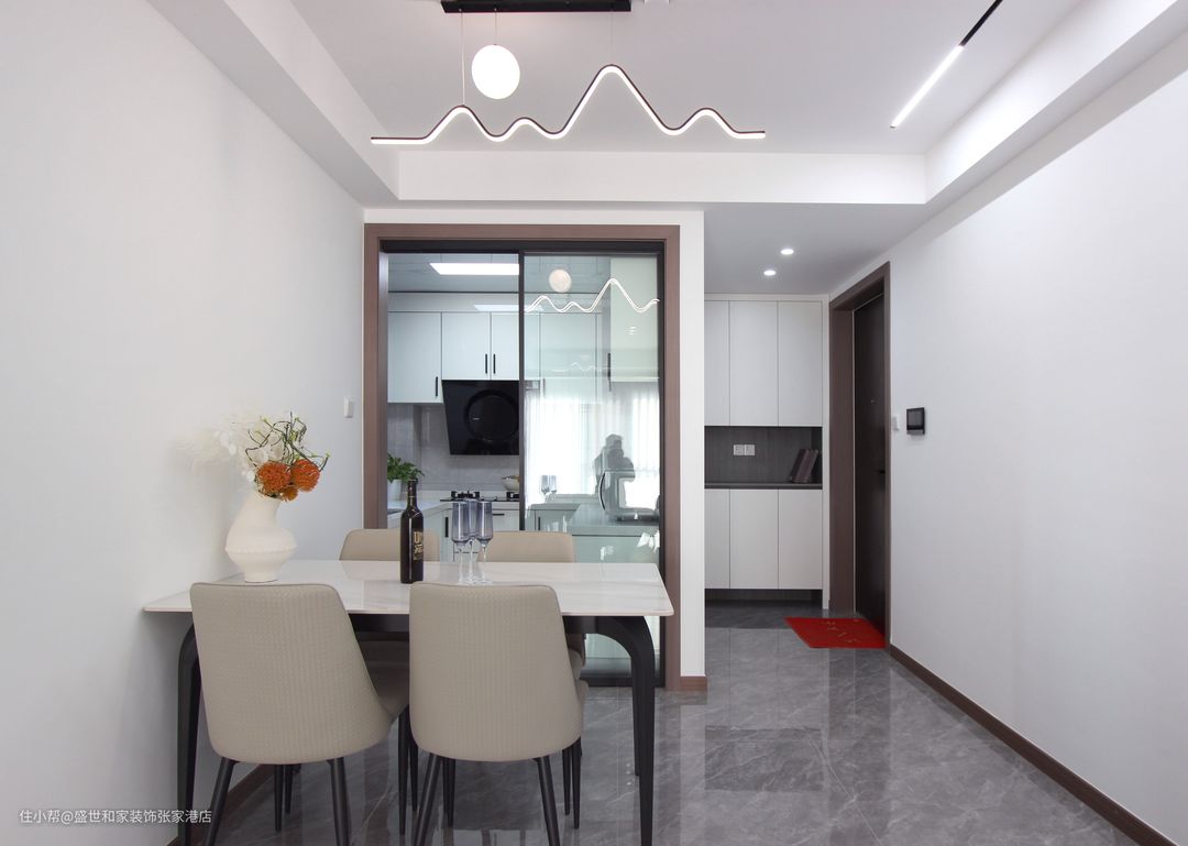 在餐厅和厨房之间,利用玻璃做隔断,不仅完美的划分了两个单独的功能区,还起到阻挡油烟的作用。
