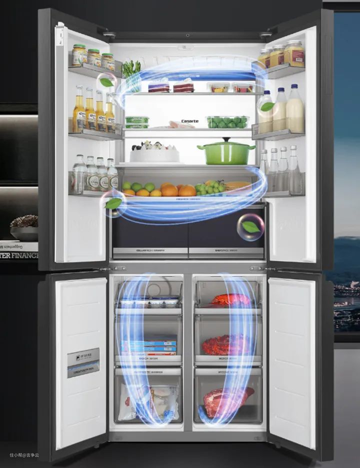 有了这个技术,冰箱就可以主动感应食材环境变化,并自动开启杀菌模式,然后智慧新风净化,可以实时检测冰箱61种食材气味,快速去除异味。除菌率达到99.999%,除味率达到99%。