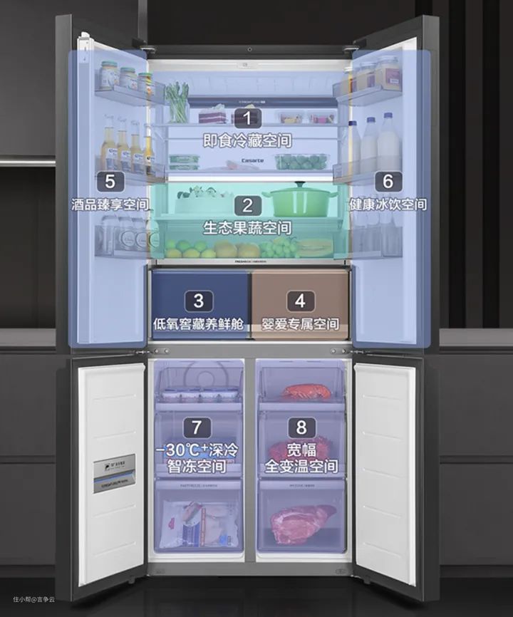内部空间分布,卡萨帝551分为冷藏区+冷冻区+宽幅变温区。