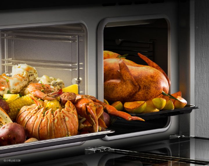 在蒸烤方面,同样是左烤右蒸的独立腔体结构,左侧为30L烤箱,烤箱顶部内置风机配合上下管热力作用,能达到三维立体烘烤的效果,烤制食材应该会比较均匀。而右侧为40L大容量蒸箱,上下温度平衡,配合蒸汽动态平衡技术,多种食材同蒸也不串味,顶部也不冷凝滴水,能保持食物的鲜味与口感。