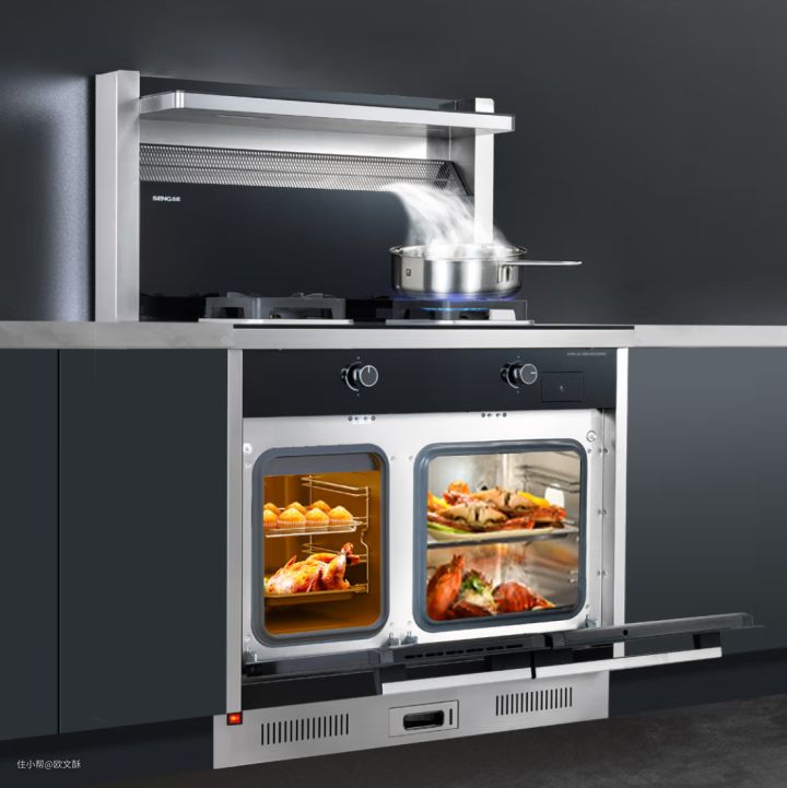 接下来说说集成模块。 集成灶除了烟灶组合之外,一般都会集成一些其他功能,例如碗柜、消毒柜、蒸烤箱等。我比较推荐的是集成了蒸烤功能的。因为无论是蒸还是烤,其实我们平时都会经常需要用到,与其买单独的蒸箱、烤箱,当然还是集成灶比较理想——既节省空间,并且蒸烤箱就在灶具的正下方,操作起来也方便,都不用挪动腿儿,就能顺手把食材丢进蒸烤箱,爆炒的同时调解下火力或者是打开蒸烤箱取出来,也相当一气呵成。 不过这里有个问题,我也要一起说明下——集成蒸烤款的集成灶,也分为蒸烤一体和独立蒸烤的,怎么选? 我建议预算充足的话,直接上独立蒸烤款,别犹豫! 原因有两个。首先,蒸和烤,虽然都是加热,但是对于功率的需求并不一致,有不少蒸烤一体的集成灶会更偏重于“蒸”,对“烤”就相对没有那么注重,因此会导致烤制食物时因为功率不够,成品火候不那么到位,尤其是烤鸡、烤羊腿或者是烤五花肉等肉质比较厚实的食材时,容易出现汁液流失,外皮不够焦脆,内里肉质有些过老的现象。第二就是把蒸箱和烤箱集成到了一起,看似容量更大,其实我们并没有那么多的乳猪或者是火鸡之类体积庞大的食材需要烹饪,所以其实单独蒸或者烤的时候,空间还是有很多富余的。但是我们如果又想吃蒜蓉生蚝又想吃芝士生蚝的话,就得进行两次蒸烤操作,不能同时“蒸烤一锅出”,这就很影响烹饪效率。 而蒸烤独立款,就完全没有上述问题。 首先蒸烤独立,可以同时兼顾蒸与烤的不同功率,蒸菜可以有更多的蒸汽包裹,锁鲜效果更好;烧烤也能自由调节火力,烤得更均匀,外焦里嫩信手拈来。 其次把蒸箱和烤箱分开,那么就意味着你可以同时进行蒸烤,如果加上灶具的话,蒸烤炖炒,四种烹饪方式同时做,烹饪效率咔咔提升。 不过这里我要提醒一下,就算是蒸烤独立,也要选择“下置风机”款,为什么?我找了张图,你们一眼就可以get到原因——