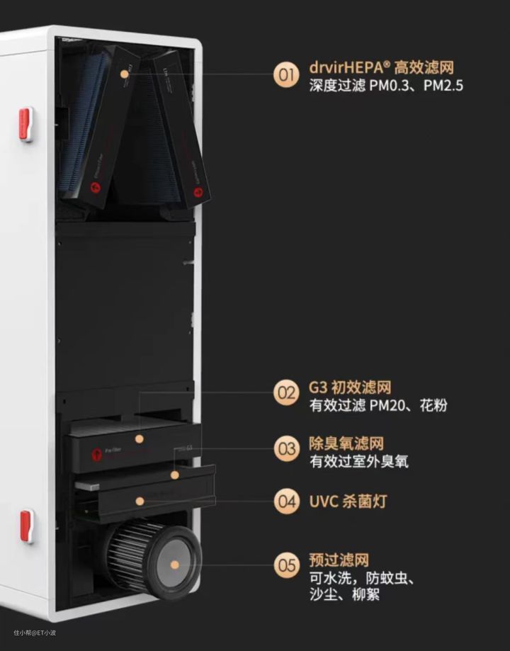 第一层是预过滤网,能够防蚊虫、沙尘、柳絮等,还支持水洗,可反复使用; 第二层是初效滤网,能够有效过滤絮状物、花粉、细屑,主要是大颗粒物的过滤; 第三层是除臭滤网,能够有效过滤室外的臭氧,维护室内空气的洁净; 第四层是UVC灯除菌,有效的做到除菌,抑制细菌的滋生; 第五层是高效滤网,配置的是2块,这可是医用级的滤芯,能够对M0.3的颗粒物有效过滤,过滤率高达99.8%,过滤能力相当的高!