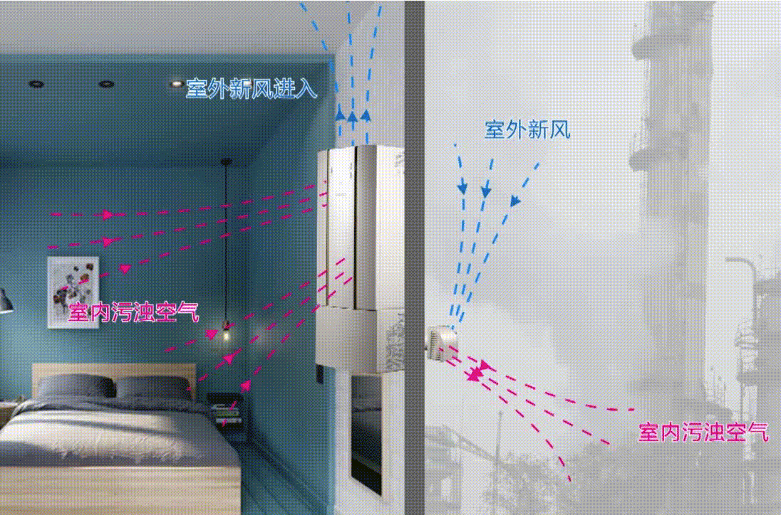 新风机就是从室外不断引入新鲜空气,然后经过滤网层层过滤之后源源不断传入室内,形成室内微正压环境,通过各种缝隙把室内的污浊空气排出(一般家庭里的门窗气闭性不是100%闭合),实现强制通风、净化空气的效果。