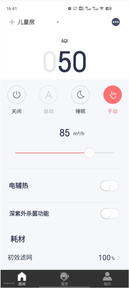 在测试之前,室内的噪音值为51.7db,开启最大风量后的噪音值为53.8db,这个噪音值是完全不会影响到小朋友休息的,在晚上使用的时候就更不会了! APP的操作也比较简单,它功能性也是多样化的,会有不同模式的选择,自动、睡眠、手动调整风量,还具有深紫外线杀菌功能,电辅热开关功能等,可以满足你在外面掌握孩子房间的空气质量,并对其可以了如指掌,即使再忙也能关心孩子!