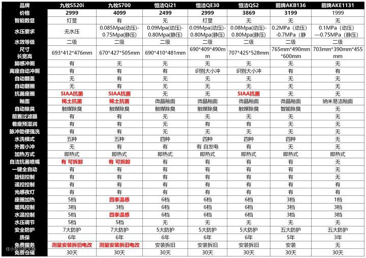 这里可以看见,其中九牧的两款智能马桶在抗菌方面还是有比较大的优势的,并且还给到了包括测量、安装、拆旧和电改在内的免费服务,而其余两家则没有电改服务,箭牌甚至连拆旧都没有纳入免费服务范围。所以这一点上,九牧还是较为优秀的了。