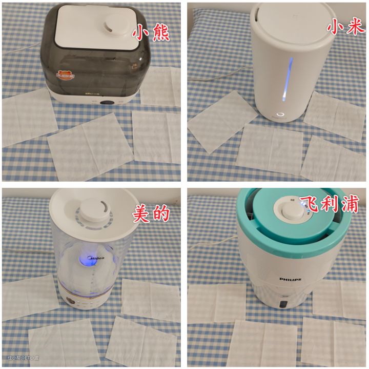 在每款加湿器附近放上一模一样的纸巾,直接开到最大档,同样开一小时后,称量前后纸巾的重量值,以此估量该款加湿器对周围环境的打湿情况。