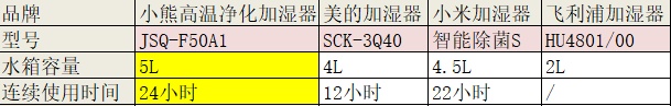 在相同的面积下,虽然从数据上看小熊、小米与美的的水箱容量相差0.5L,但是在连续使用时间上可以看出有很大的差别,小熊支持24小时,小米支持22小时,美的则是支持12小时,所以,大容量水箱还是代表着使用时间更长,而且还避免了频繁加水的麻烦性。