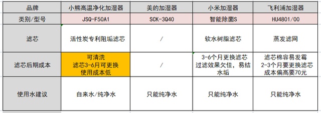本期测评为大家带来的是小熊JSQ-F50A1、美的SCK-3Q40、小米智能除菌款S、飞利浦HU4801/00这四款常见大品牌加湿器的横评实测,从多个维度测试,来看看哪款加湿器更值得这个秋冬入手。 将4款产品的详细制作成了表格,方便朋友们的参考