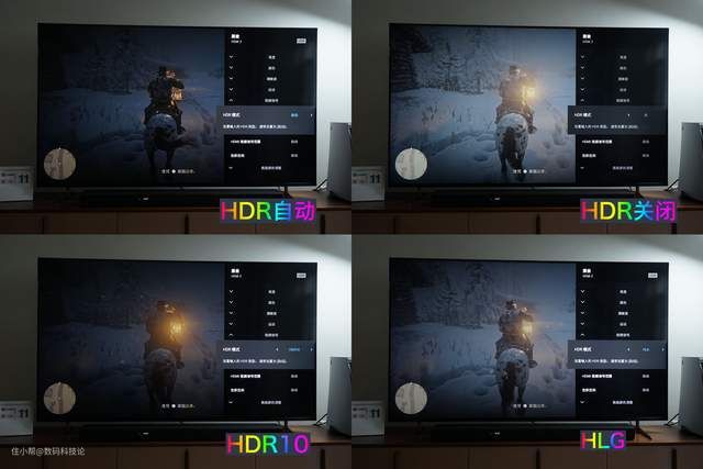 此外,电视支持HDR\HDR10\HLG色彩模式自定义,这种自定义也可以带来更适合自己使用习惯的显示画面,下图是《荒野大镖客》游戏场景在不同模式下的色彩表现。我个人更喜欢HDR10的动态表现,既能体现夜的黑,也能感受马灯照亮雪地的氛围感。