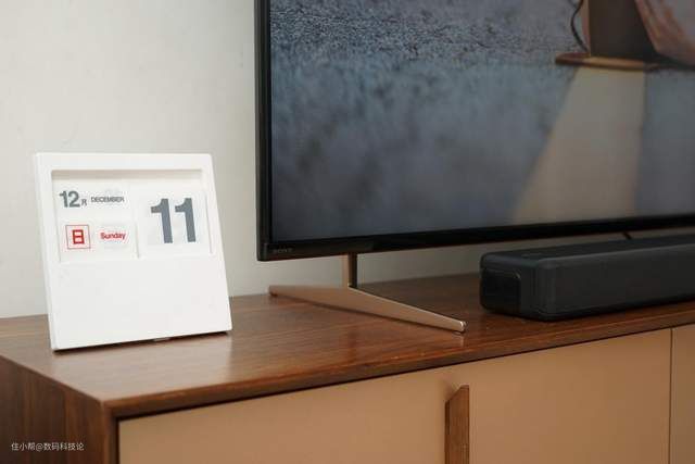 并且这个支架高度也是为匹配回音壁专门进行了高度优化。在40cm宽度的电视柜上摆放的时候,回音壁不遮挡电视底边,也不影响遥控器使用。而且不喜欢突出位置摆放还可以直接放在电视下。