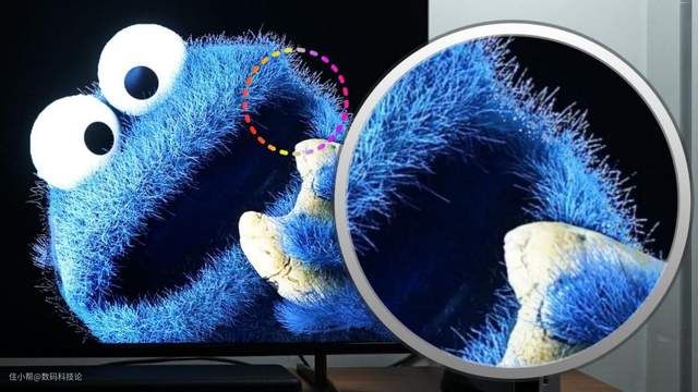 比如显示上图这张卡通图,黑色背景完全是融入夜色中的感觉,但蓝色高亮的毛绒卡通,用500%的放大率查看,每一根毛线都是很清晰,并且边缘整齐,给人一种边界分明的清晰感。