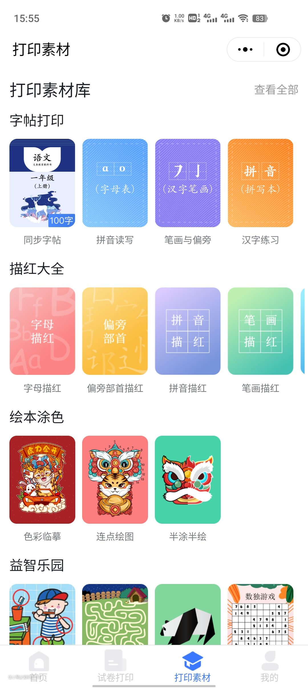 得力L511W 的随心印小程序,里边含有很丰富的打印模板,可以满足多样化的打印需求。就我家像孩子平时需要的习题、字帖、范文等资料不需要去花钱购买,登录随心印小程序就可以直接获取并打印,既省去了开支,还可以帮助孩子在学习中成长,真是一举两得。