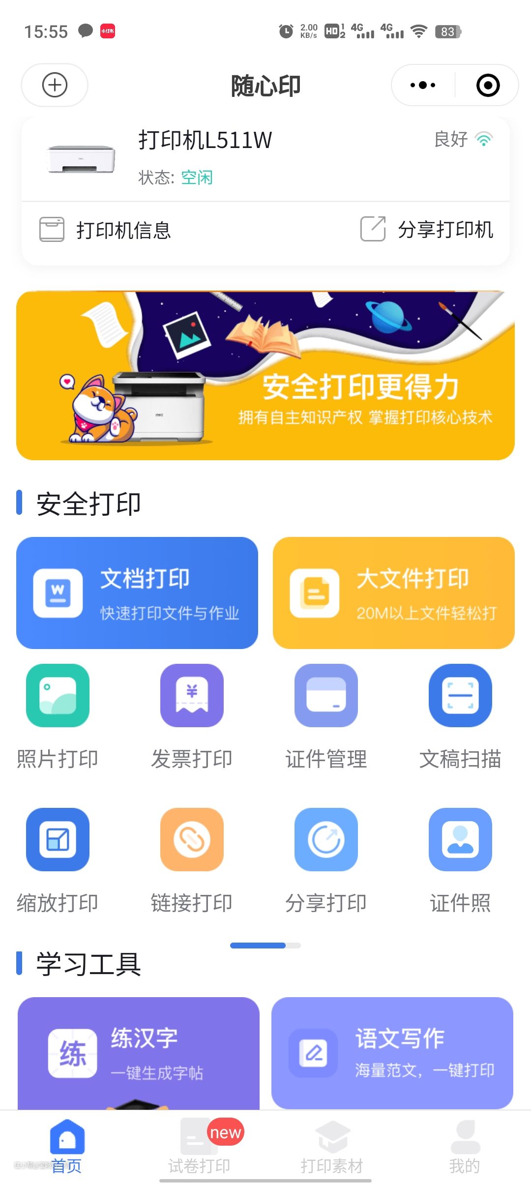 3、得力打印机搭载的随心印小程序含有很丰富的免费打印模板,可以打印孩子们平时 所需要的习题、字帖、范文等资料;而且还支持远程操控,就算出门在外,也可以随时打印到家。操作简单,使用方便。