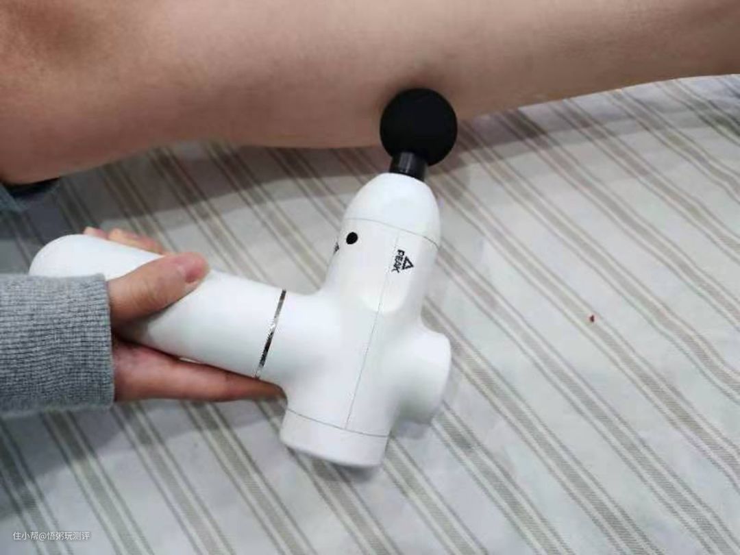 前面也说了,匹克mini筋膜枪的大小和重量都是比倍益康筋膜枪C1要大很多,使用过程中的灵活度没有那么高,而且拿久了手会酸累;在测评过程中,使用体验方面它也是不如倍益康筋膜枪C1的,从动图上我们可以直观看出同样的按摩头,倍益康筋膜枪C1的按摩力度比匹克mini筋膜枪的更到位且对肌肉作用的范围也更大,对肌肉的按摩放松效果更好!