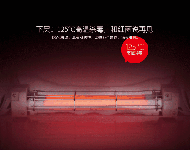 - 高温消毒 :利用不同细菌对较高温度的敏感程度通过发热管使柜内温度迅速升高到125℃,改变微生物内蛋白质结构,让各种酶丧失活性,来进行有效杀菌,也就是将细菌活活“热”死。杀菌完成后一般建议放置一段时间再取出餐具。