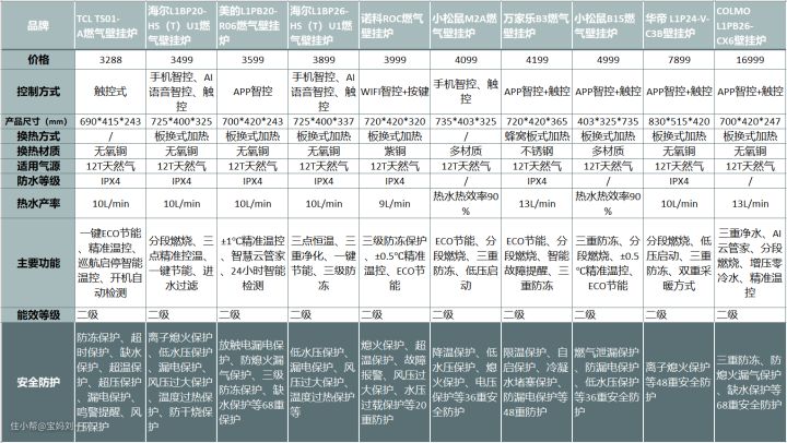 这三款里面,性能配置方面,三款基本没有太大区别,都有精准控温、分段燃烧和防冻这几个核心技术。