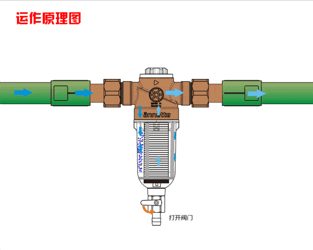 这类型的前置过滤器内部安置不锈钢滤网进行过滤,其主要的动力主要来自于水压,水压通过滤网,从而拦截杂质,再通过打开阀门排出杂质。直冲式过滤器的滤网的孔径多为50-100um。