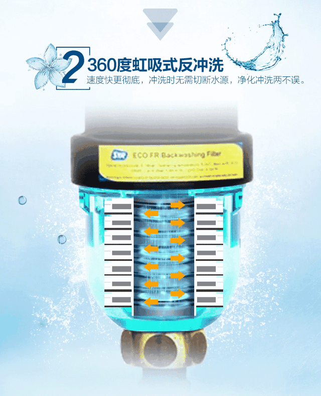 这款前置过滤器内部采用弹力结构设计,旋转清洗,方便快捷;经过NSF浸泡测试,可以有效杜绝二次污染;滤芯只需要定时清理,无需更换,使用起来很划算。