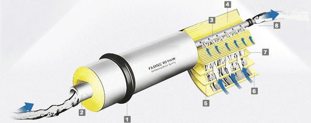叠片式的前置过滤器,其内部是由特定的塑料碟片交错沟槽交叉而成,利用这种不规则的缝隙来过滤掉水中的杂质。其过滤的孔径在100微米左右。