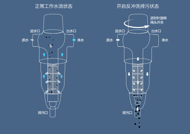 反冲式过滤器的工作原理与直冲式相似,但是无论是过滤效果还是冲洗杂质上,都做的更出色。它的过滤精度基本在40微米左右,且在冲洗杂质方面,利用水流转外压时的方式,反向冲掉杂质。