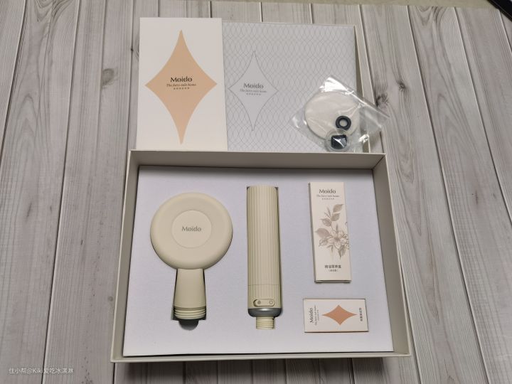 1、外包装 在打开 Moido小活泉花洒 的包装盒之前,突然有一种开盲盒的感觉。它的外包装设计采用的是图案搭配高端且有质感,迫不及待地想知道里面藏着的惊喜。