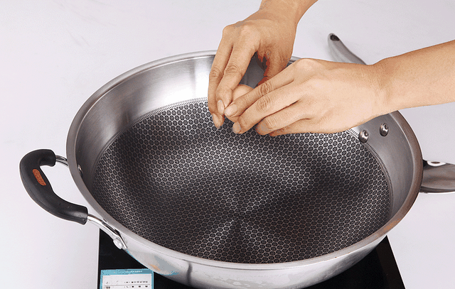 这款炒锅它是不粘锅的,而且它里面用的是316L不锈钢材质,据说这种材质更加的安全呢。这款锅的内胆是采用的蜂窝纹理设计,是独家专利技术,因为这个技术比传统的锅炒出来的菜更加的入味,而且还不用担心炒糊的情况出现,它的细节设计的也非常的好,在手柄那里设计了真空处理,拿在手里还是蛮重的,整体还是特别满意。