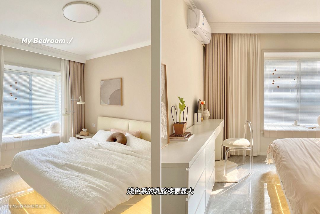 - 显大:我家房子是120㎡的建筑面积,套内只有92㎡,乳胶漆选得都是浅色系,客厅奶油白色、卧室浅奶油色。乳胶漆是非常薄的一层,不像木饰板、软硬包造型那样会凸起,整体效果是既温馨又显大。