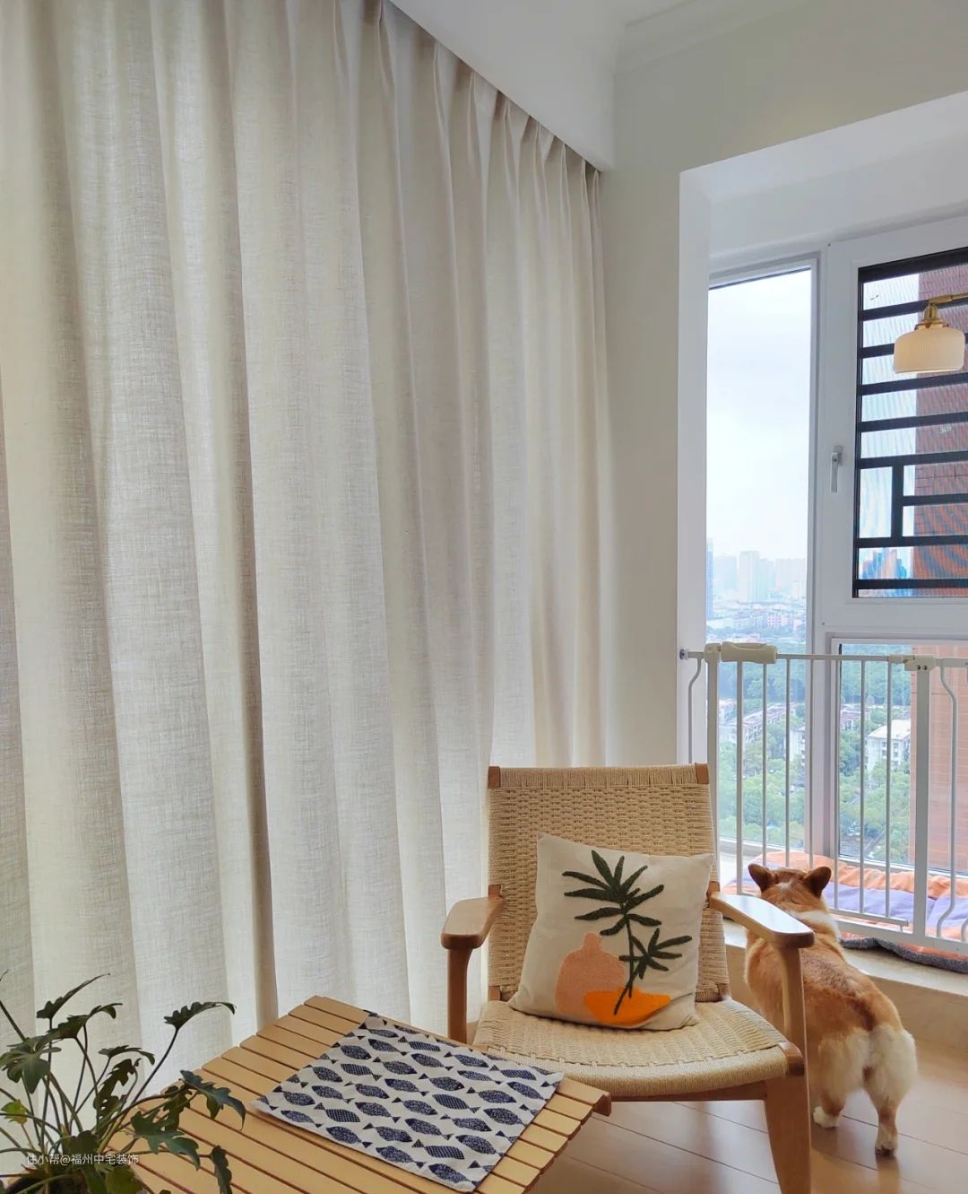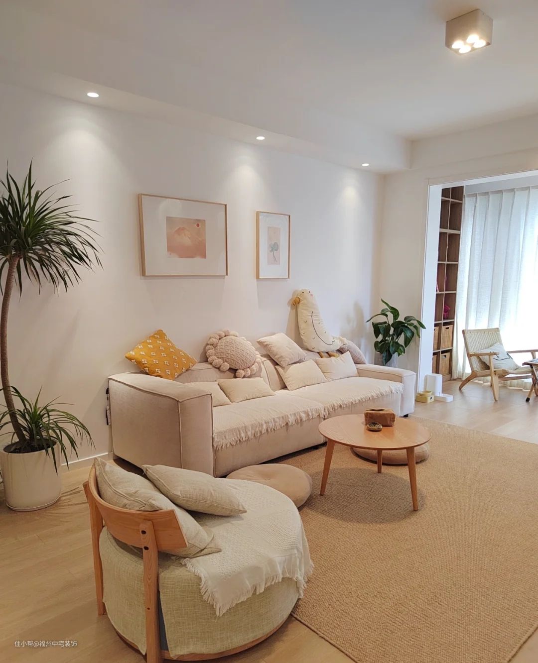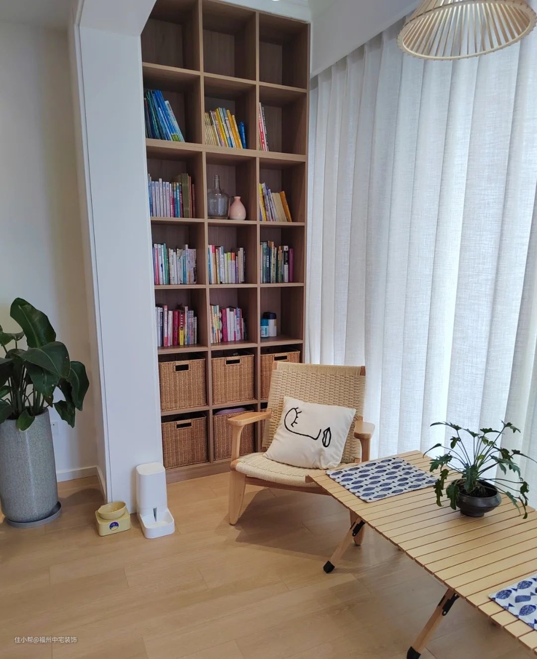 整体布局温馨素雅,家具以原木为主,搭配白色衬布