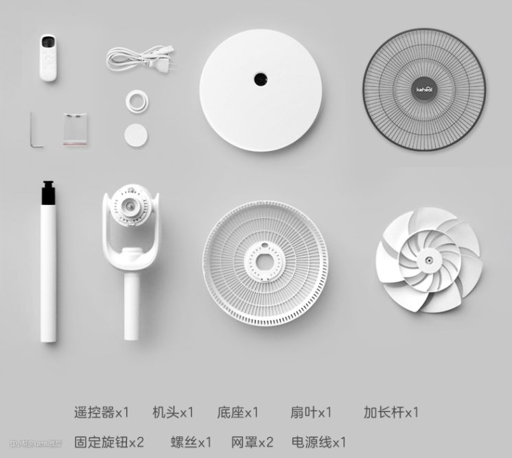 首先来介绍下我现在使用的新款科西R5空气循环扇吧,当时是在天猫销量榜上看到,了解了一下功能配置和1年换新10年电机保修的售后政策后很心动,入手一台试试看,从收到产品的那一刻开始就开始心动了~整体产品很简单,包括机头、扇叶、前后网罩、底座、加长杆、遥控器和其它一些配件。