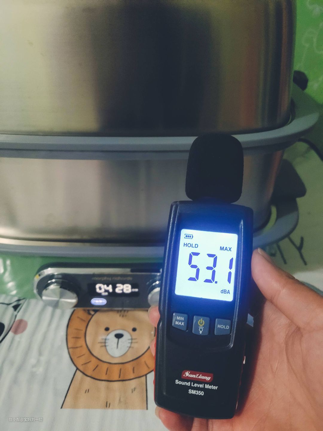 摩飞极速电蒸锅在降噪方面处理还是不错的,烹饪的过程中运行声音很轻,最大只有53.1dB,站在锅的前面可以清楚的听到声音,但不大,比说话声要小,要是出了厨房就完全听不到蒸炖锅的运行声音。
