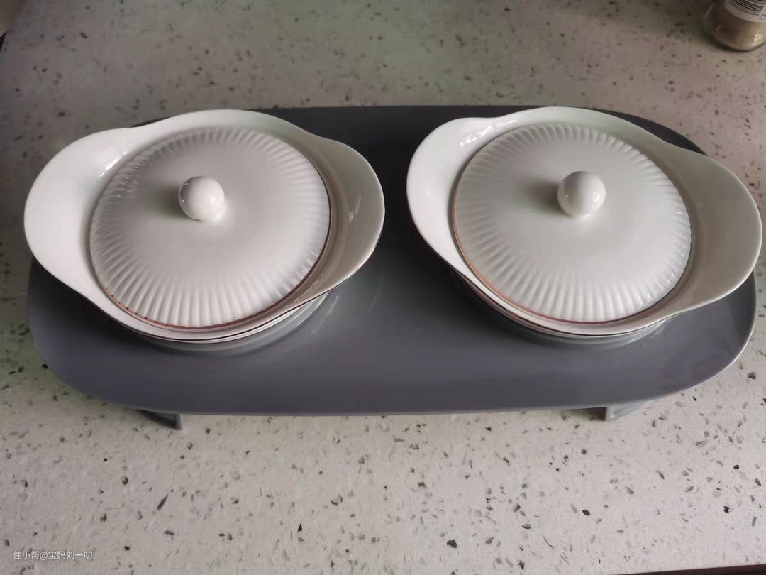 这个炖盅配有一个支架搭配使用,两个炖盅都有盖子,在蒸鸡蛋的过程中可以用盖子盖住,防止锅里的蒸汽进入到盅里破坏口感。