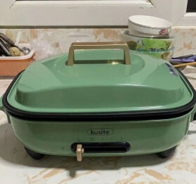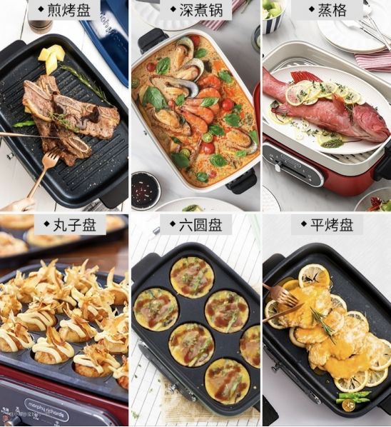 整机是英伦复古的造型,很有70、80年代那种感觉。蒸格+深煮锅+煎烤盘的标配,能满足不同场景的美食需求。